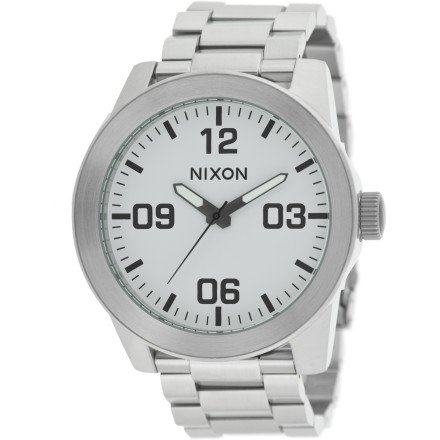 Stripped of all but the essential function of keeping true time, the Corporal from Nixon distinguishes itself as a leader. MOVEMENT: 3 hand Japanese quartz. CASE: 48mm diameter, 10 ATM/100 meter stainless steel with enamel filled crown. Raised bezel designed to protect the hardened mineral crystal. Nixon The Corporal SS - Men's ( White ) Do not Miss!! Stripped of all but the essential function of keeping true time, the Corporal from Nixon distinguishes itself as a leader. MOVEMENT: 3 hand Japanese quartz. CASE: 48mm diameter, 10 ATM/100 meter stainless steel with enamel filled crown. Raised bezel designed to protect the hardened mineral crystal. ... Nixon The Corporal SS - Men's ( White )